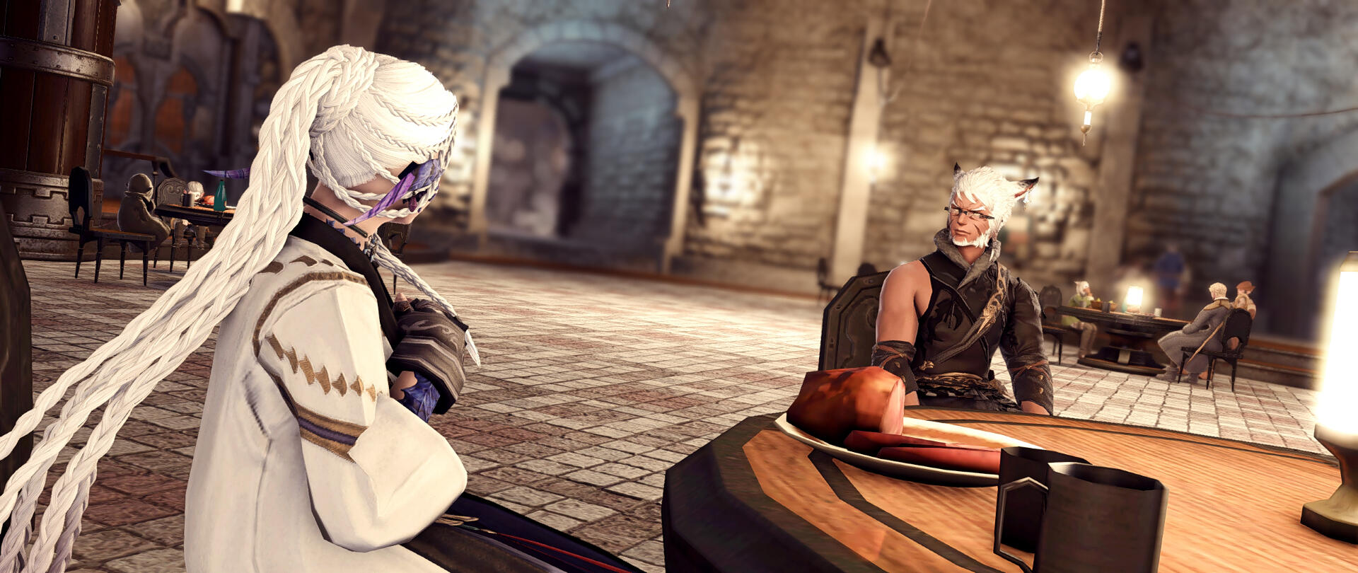 The tale she told brought a smile to X'jinh's face. It reminded him of several younger Tia from the tribe who'd chosen to leave and make their own way during his time as Nunh. He'd gone through much the same when he finally left the tribe himself, journeying to unfamiliar lands and finding himself lost among strangers with customs he barely knew.Impressed by the young Xaela's decisiveness and the bond she'd forged with her feline companion, X'jinh made Talyah an offer that he'd only given a few others over the years. Should she need a place to stay between jobs and a mentor to teach her the ways of the west, the old Miqo'te would be happy to take her under his wing.Talyah was independent, but she was hardly foolish enough to pass up a chance at a warm bed and knowledge that could put her on firm footing in this foreign land. Besides, Batu seemed calm enough in X'jinh's presence so she felt little reason to doubt his intentions. She gladly accepted the offer and to seal the deal, X'jinh ordered them a pair of drinks.