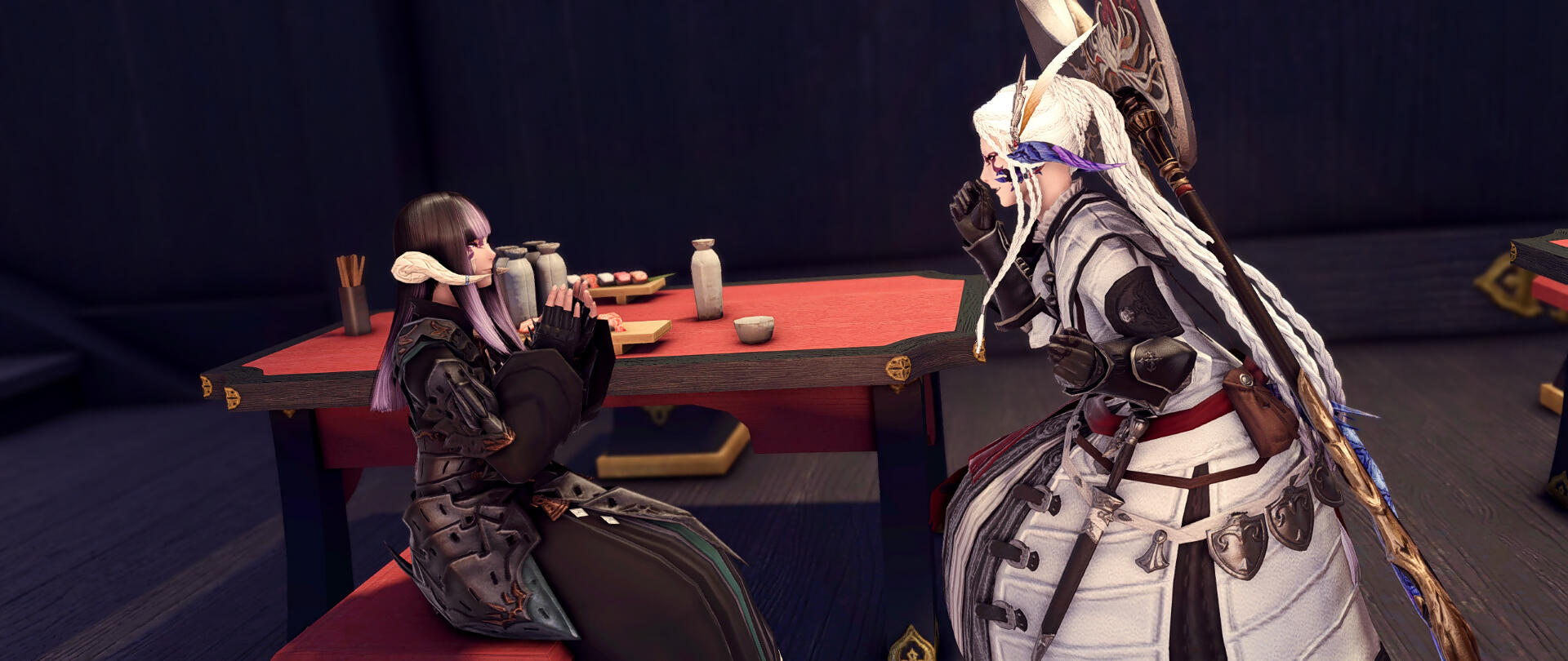 In Kugane, Talyah presented the Clan Centurio representative Wlveva with X'jinh's letter. After perusing its contents, Wlveva appraised Talyah and remarked that if it was opportunity she sought, the Far East had plenty to offer for a hunter of her skills and reputation. With her record, she was certainly fit to take on Veteran Clan marks. With time, perhaps she'd even join the ranks of the Clan's elite.After taking several mark bills from the board, Talyah left Batu and Tseren with Wlveva to avoid causing a commotion in the Shiokaze Hostelry. Inside, she glanced around and scanned the clientele for possible competitors - or even teammates. While she was used to hunting as a solitary pursuit, if she aimed to climb the ranks and become one of the elite, it wouldn't hurt to start making allies who might take on stronger marks alongside her.It seemed that most customers were ordinary citizens enjoying food and drink alone or with company. A few sailors were scattered among the tables, easily identifiable from their garb and rougher temperament. No one stood out terribly, save for a woman in leather armor seated alone at a table full of drinks with a book in her lap. Her curiosity piqued, Talyah approached the woman.